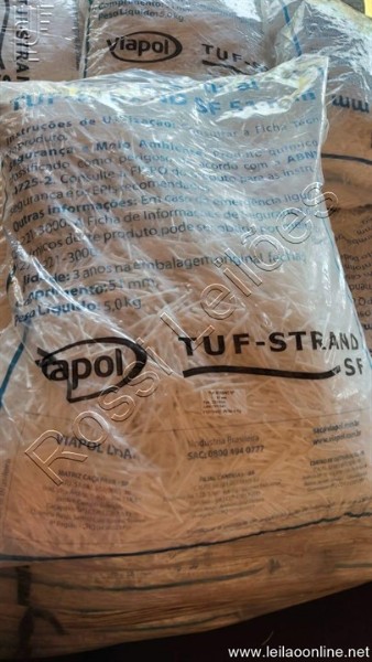 LOTE COM SACOS DE RESINA USADOS EM CONCRETAGEM DE PISOS, VIAPOL, VALIDOS ATÉ JUL 2027, SENDO: 555 SACOS DE TUF STRAND SF (saco 5 KG) E 16 EMBALAGENS DE FIBERSTRAND 100 (emb. de 18 KG.)