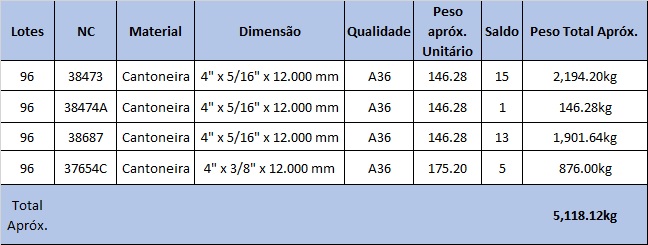 Lote com: Apróx. 5.118,12kg de CANTONEIRAS DIVERSAS (AÇO CARBONO) Conforme relação - (NC:38473,38474A,38687,37654C)