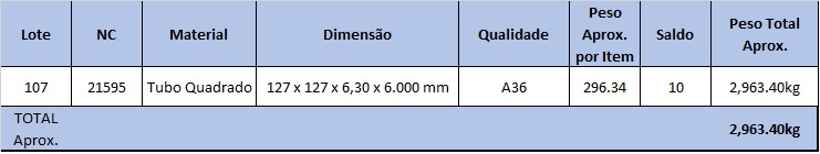 Lote com: Apróx. 2.963,40kg de TUBOS QUADRADOS DIVERSOS (AÇO CARBONO)- conforme relação ( NC: 21595)